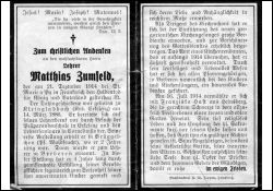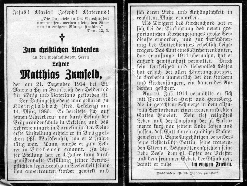 Gefallener 1. Weltkrieg; Präparandenschule Erkelenz, Lehrerseminar in Cornelimünster; 1. Anstellung als Lehrer in Brüggelchen (Pfarre Waldfeucht), dann 4 J. in Breberen; dort Leiter des Kirchenchores und Einführer des Gregorianischen Chorals; Anfang 1914 Übernahme des Amtes des Kirchenrendanten; ∞ 16.7.1914 Franziska Hast aus Heinsberg; Druck in Heinsberg |