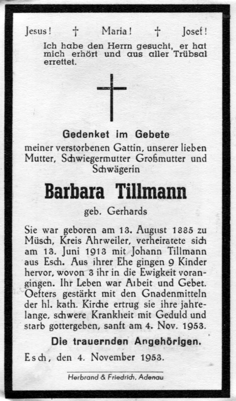 ∞ 13.6.1913 Johann Tillmann aus Esch; 9 K., davon 3 †; jahrelange Krankheit; Druck in Adenau |