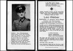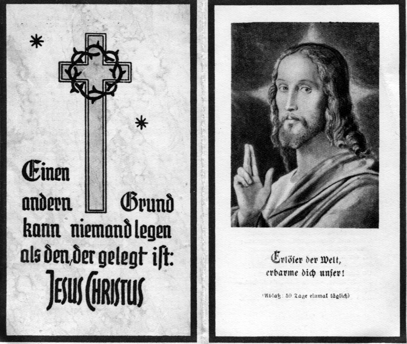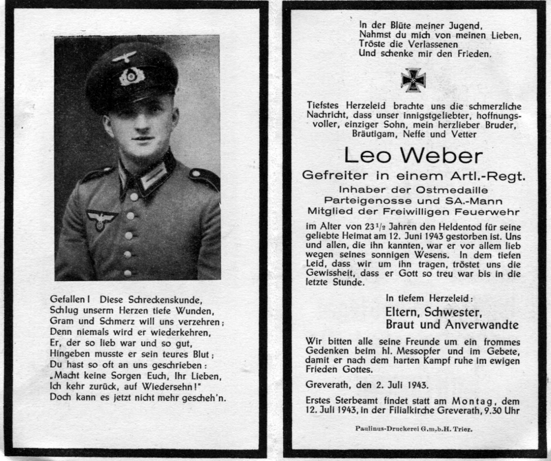 Gefallener 2. Weltkrieg; 23 1/2 Jahre; verlobt; Wohnort: Greverath; Mitgl. der Freiw. Feuerwehr; Druck in Trier |
