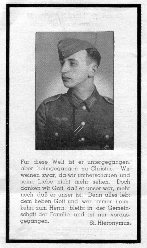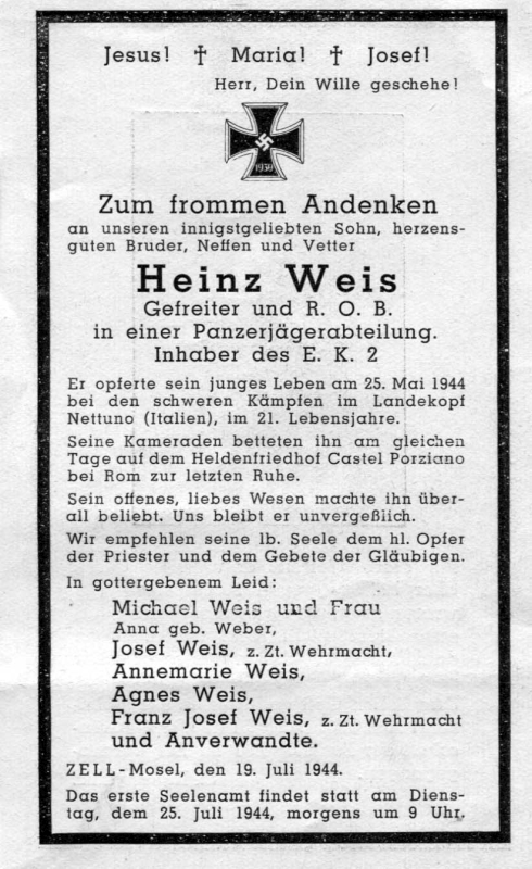 Gefallener 2. Weltkrieg; 21 J.; Heldenfriedhof Castel Porziano b. Rom; Eltern: Michael Weis u. Anna geb. Weber; Wohnort: Zell, Mosel |