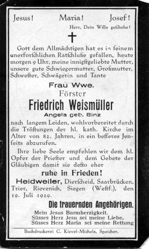 82 J.; langes Leiden; ∞ Förster Friedrich Weismüller; Druck in Speicher |