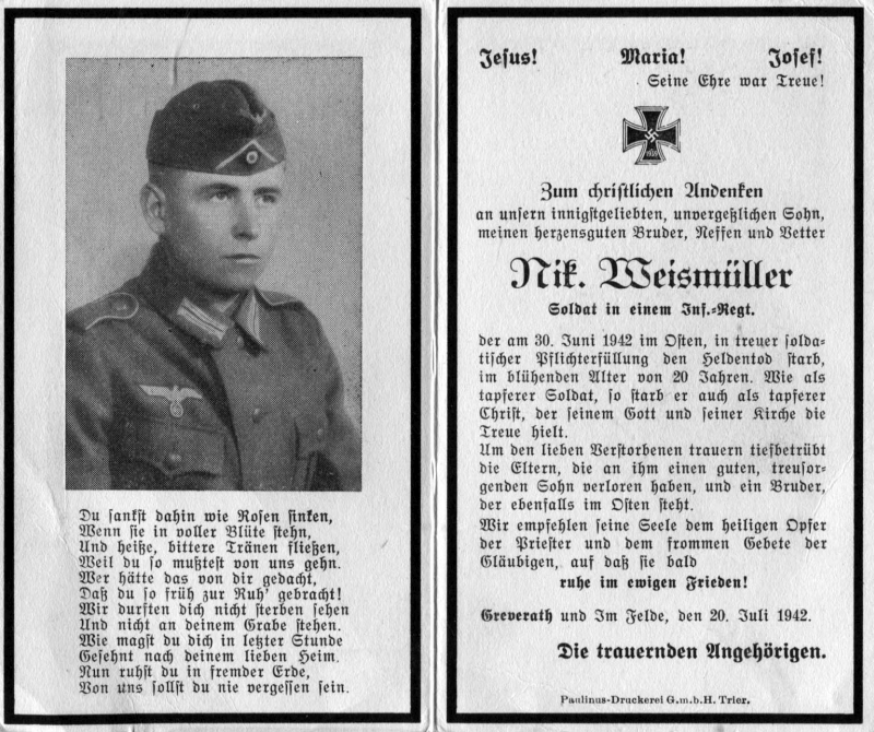 Gefallener 2. Weltkrieg; 20 J.; Wohnort: Greverath; Druck in Trier |