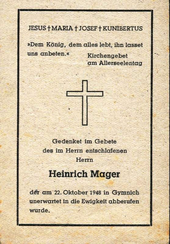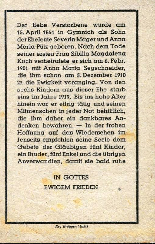 Eltern: Severin Mager und Anna Maria geb. Pütz; ∞ Sibilla Magdalena Koch † ; ∞ 6.2.1901 Anna Maria Segschneider † 5.12.1910; 6 K. davon 1 † 1919; |
