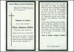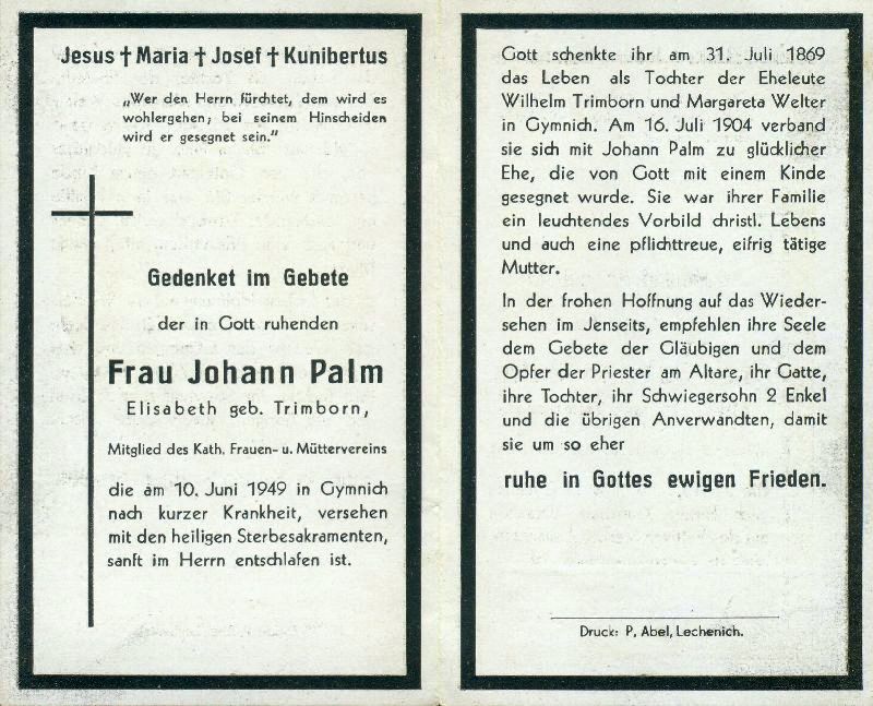 Eltern: Wilhelm Trimborn und Margareta Welter; ∞ 16.7.1904 Johann Palm, 1 Tochter. |