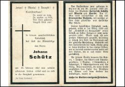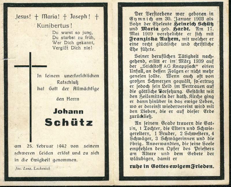 Eltern: Heinrich Schütz und Maria Hardt; ∞ 17.5.1929 Franziska Außem; 1 Tochter; März 1939 Unfall Stickstoff AG Knappsack |