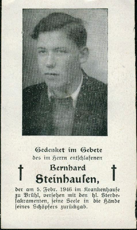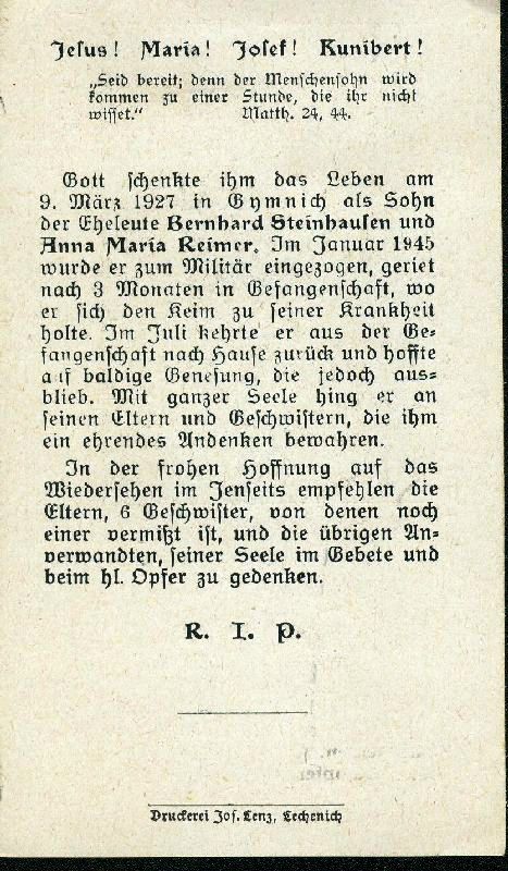 Eltern: Bernhard Steinhausen und Anna Maria Reimer; 6 Geschwister, 1 vermisst; Opfer 2. Weltkrieg |