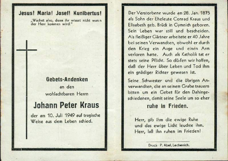 Gärtner; Eltern: Conrad Kraus und Elisabeth Brück; Kriegsversehrter 1. Weltkrieg; aus Gymnich |