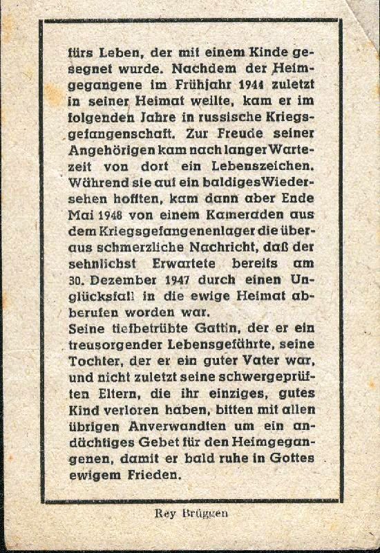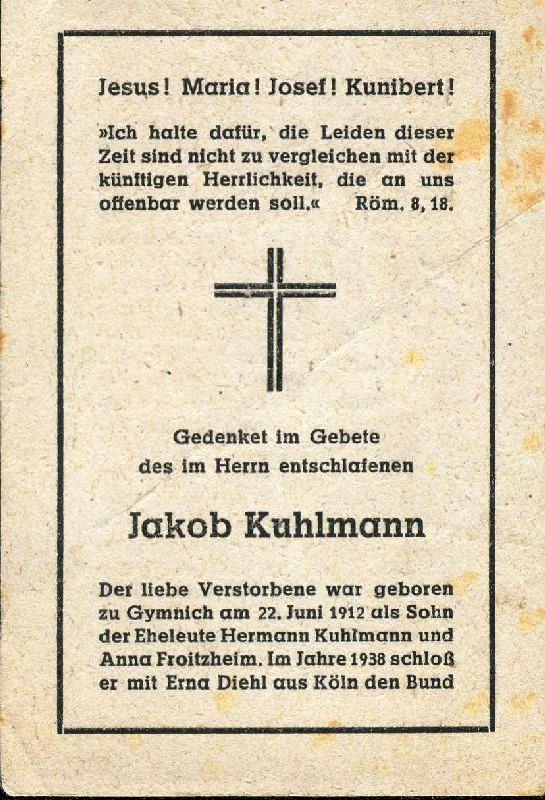 Eltern: Hermann Kuhlmann und Anna Froitzheim; ∞ 1938 Erna Diehl aus Köln; 1 Tochter.; im Kriegsgefangenenlager verunglückt; Opfer 2. Weltkrieg |