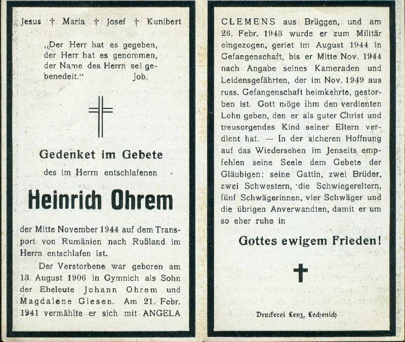 Eltern: Johann Ohrem und Magdalene Giesen; ∞ 21.2.1941 Angela Clemens aus Brüggen; 1944 Gefangenschaft, Opfer 2. Weltkrieg |