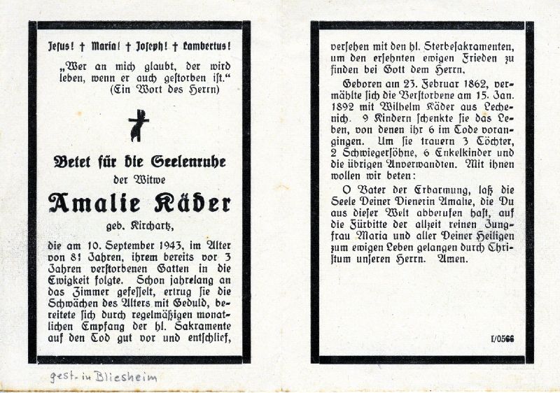 ∞ 15.1.1893 Wilhelm Käder aus Lechenich; 9 K.; davon6 † |