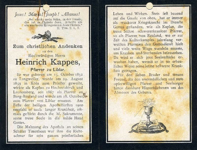 Pfarrer zu Burg-Reuland, Liblar 18.10.1886; Priesterweihe29.8.1859 in Köln; |