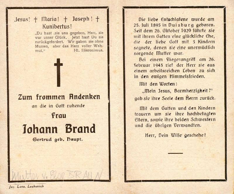 ∞ 26.10.1920 Johann Brand; 3 K. ; Opfer 2. Weltkrieg |