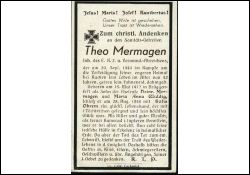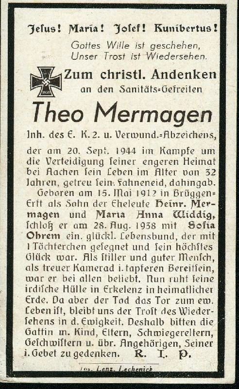Eltern: Heinrich Mermagen und Maria Anna Widdig: ∞ 28.8.1938 Sofia Ohrem; 1 K.; Gefallener 2. Weltkrieg |