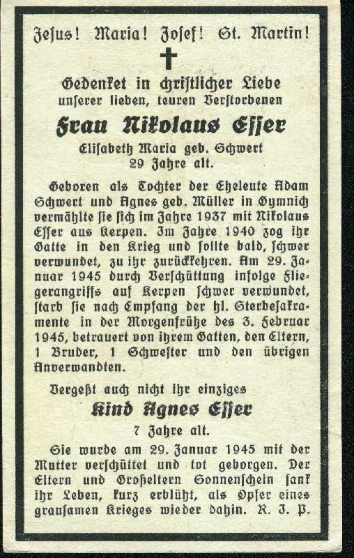 Eltern: Adam Schwert und Agnes Müller; ∞ 1937 Nikolaus Esser; Opfer 2. Weltkrieg |