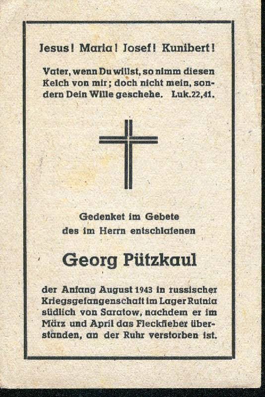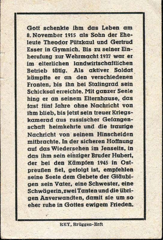 Landwirt; Eltern. Theodor Pützkaul und Gertrud Esser; Opfer 2. Weltkrieg |