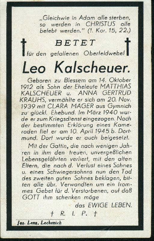 Eltern: Matthias Kalscheuer und Anna Gertrud Krauhs; ∞ 20.11.1939 Clara Mager; Gefallener 2. Weltkrieg |