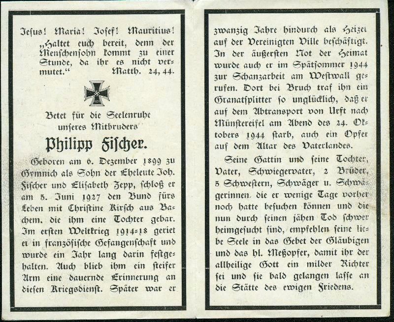 Heizer Vereinigte Ville; Eltern Johannes Fischer und Elisabeth Zepp; ∞ 5.7.1927 Christine Kirsch, 1 K. Gefallener 2. Weltkrieg |