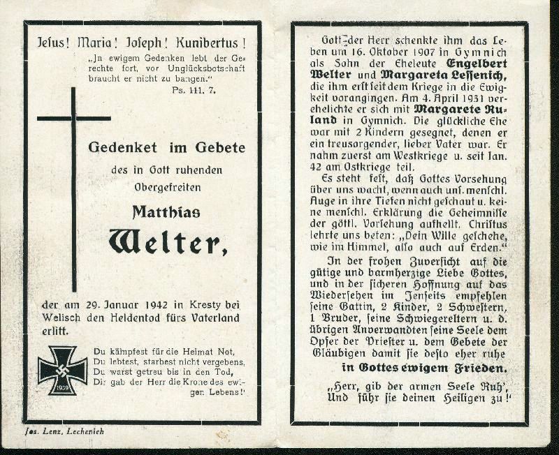 Eltern: Engelbert Welter und Margareta Lessenich: ∞ 4.4.1931 Margarete Ruland; 2 K.; Gefallener 2. Weltkrieg |