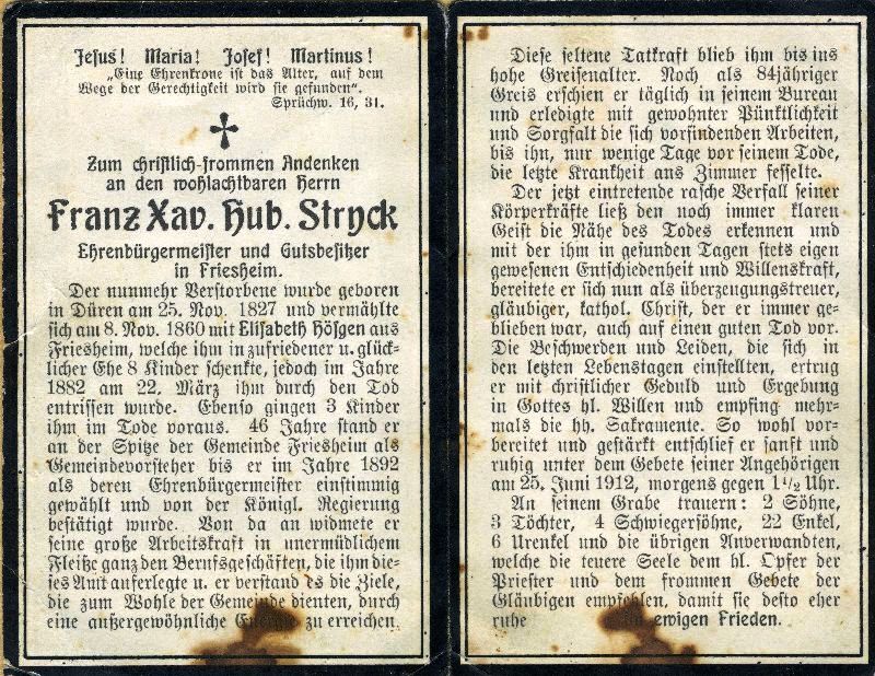 Ehrenbürgermeister und Gutsherr in Friesheim, ∞ 8.11.1860 Ellisabeth Höfgen, † 22.3.1882; 8 K. |