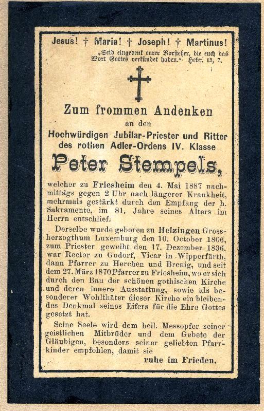 Pfarrer in Friesheim; Priesterweihe 17.12.1836; Ritter des rothen Adler-Ordens |