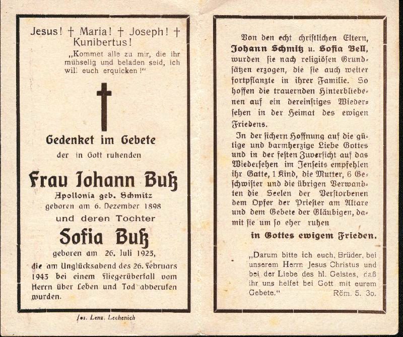 Eltern: Johann Schmitz und Sofia Bell; ∞ Johann Buß; 2 K. ; Opfer 2. Weltkrieg |