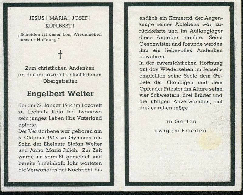 Eltern: Stefan Welter und Anna Maria Jülich; Gefallener 2. Weltkrieg |