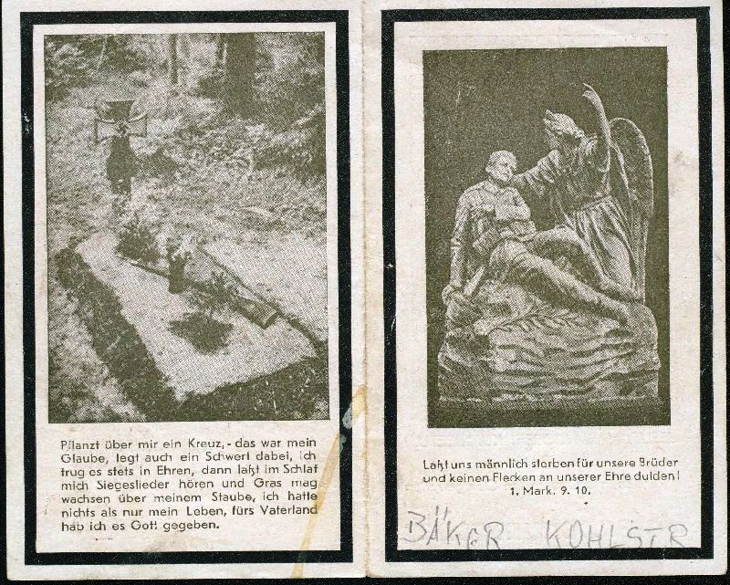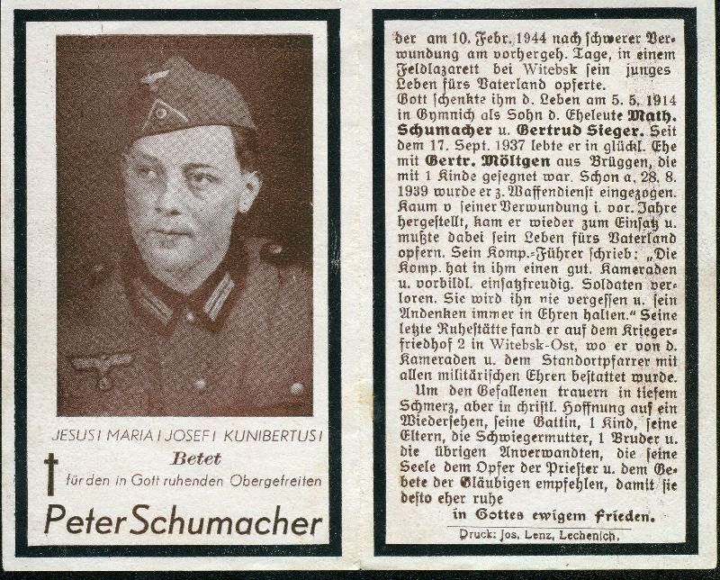 Eltern: Matthias Schumacher und Gertrud Sieger; ∞ 17.9.1937 Gertrud Möltgen; 1 K.; Gefallener 2. Weltkrieg |