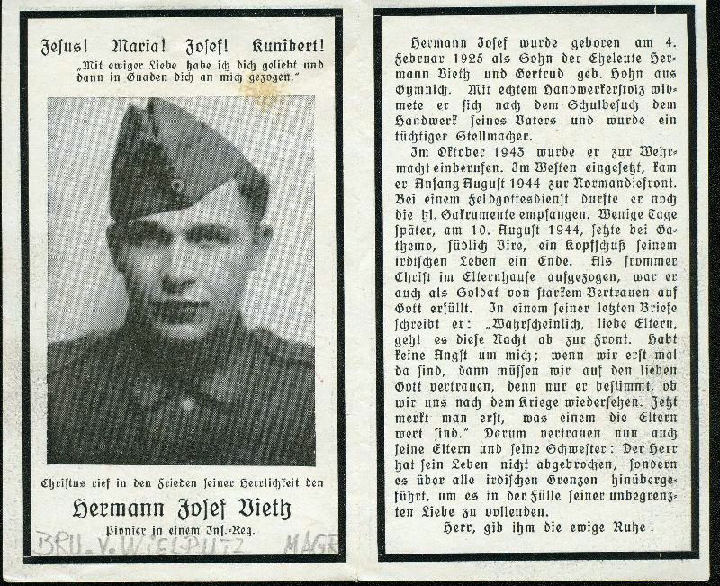 Stellmacher; Eltern: Hermann Vieth und Gertrud Hohn; Gefallener 2. Weltkrieg |