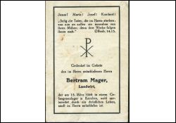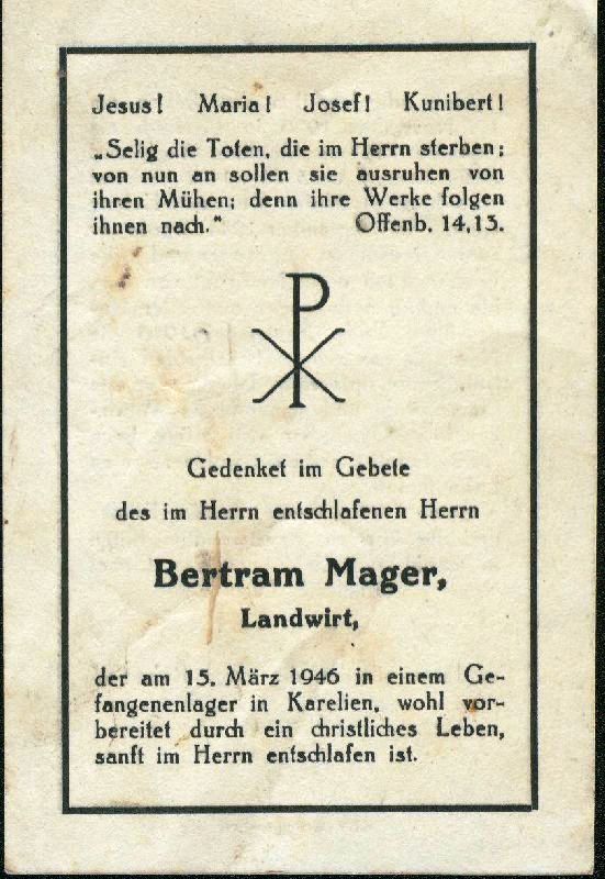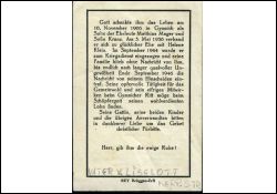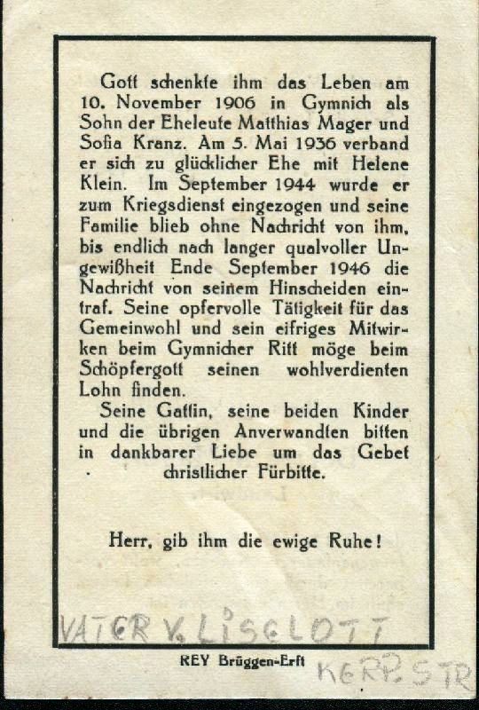 Landwirt; Eltern: Matthias Mager und Sofia Kranz; ∞ 5.5.1936 Helene Klein; Gefallener 2. Weltkrieg |