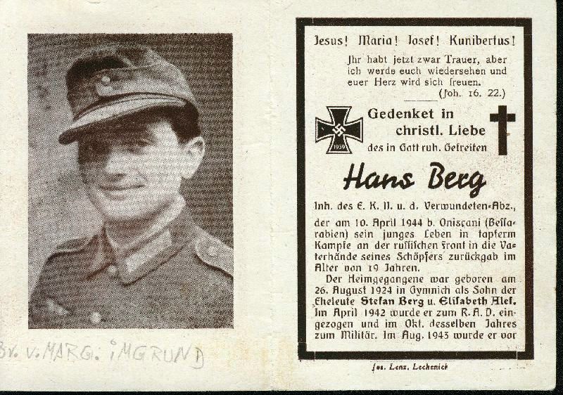 Eltern Stefan Berg und Elisabeth Alef; Gefallener 2. Weltkrieg |