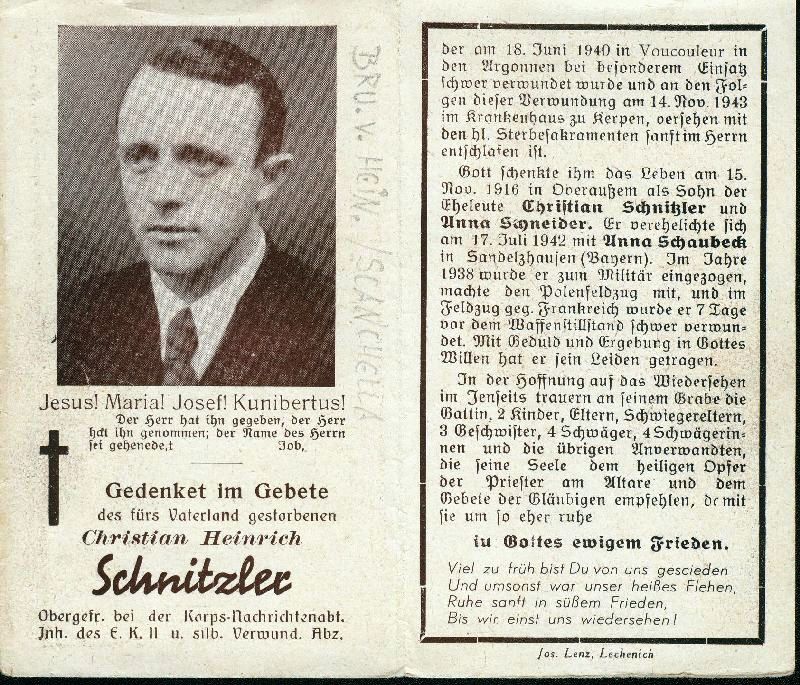 Eltern: Chrristian Schnitzler und Anna Schneider; ∞ 17.7.1942 Anna Schaubeck; 2 K.; Opfer 2. Weltkrieg |