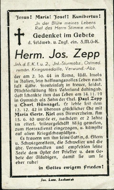 Friseur; Eltern: Paul Zepp und Charlotte Bünnagel; ∞ 12.12.1942 Maria Gertrud Kiel; Gefallener 2. Weltkrieg |