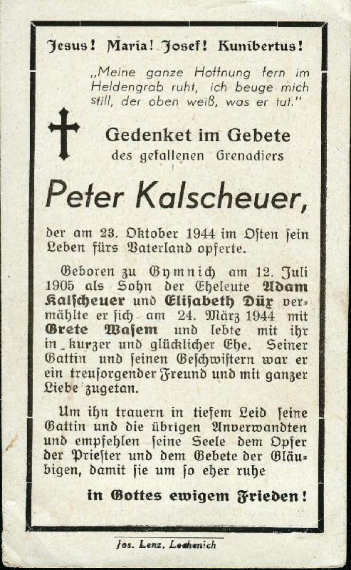 Eltern: Adam Kalscheuer und Elisabeth Dürr; ∞ 24.3.1944 Grete Wasem; Gefallener 2. Weltkrieg |