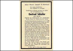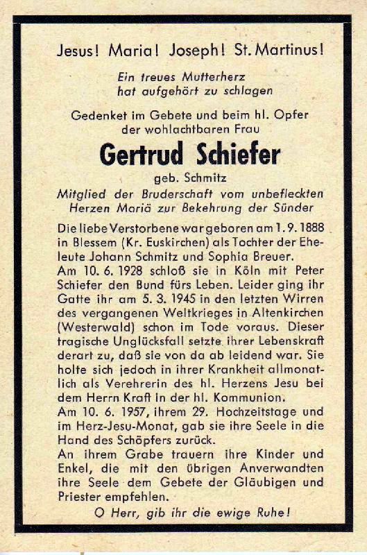 Eltern: Johann Schmitz und Sophia Breuer; ∞ 10.6.1928 Peter Schiefer † 5.3.1945; mehrere K. |