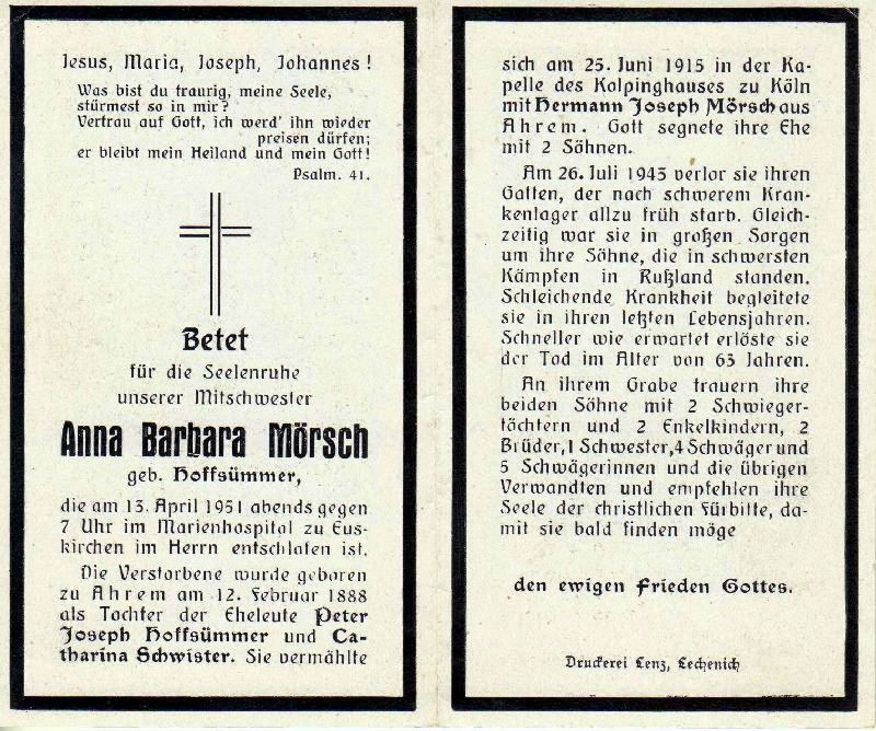 Eltern: Peter Josef Hoffsümmer und Catharina Schwister; ∞ 25.6.1915 Hermann Josef Mörsch † 26.7.1943; 2 K. |