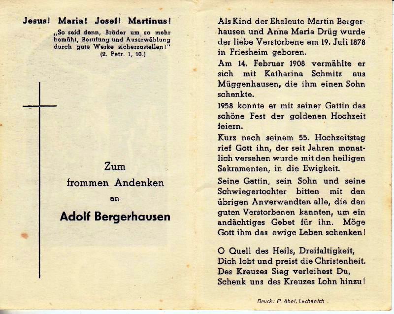 Eltern: Martin Bergerhausen und Maria Anna Drüg; ∞ 14.2.1908 Katharina Schmitz aus Müggenhausen, 1 K. |