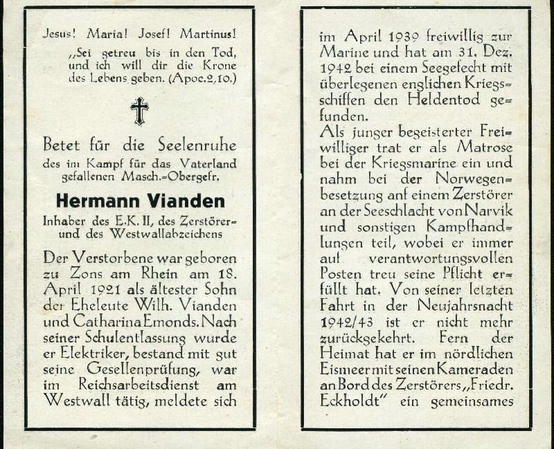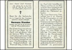 Elektriker; Eltern:Wilhelm Vianden und Catharina Emonds, Gefallener 2. Weltkrieg |