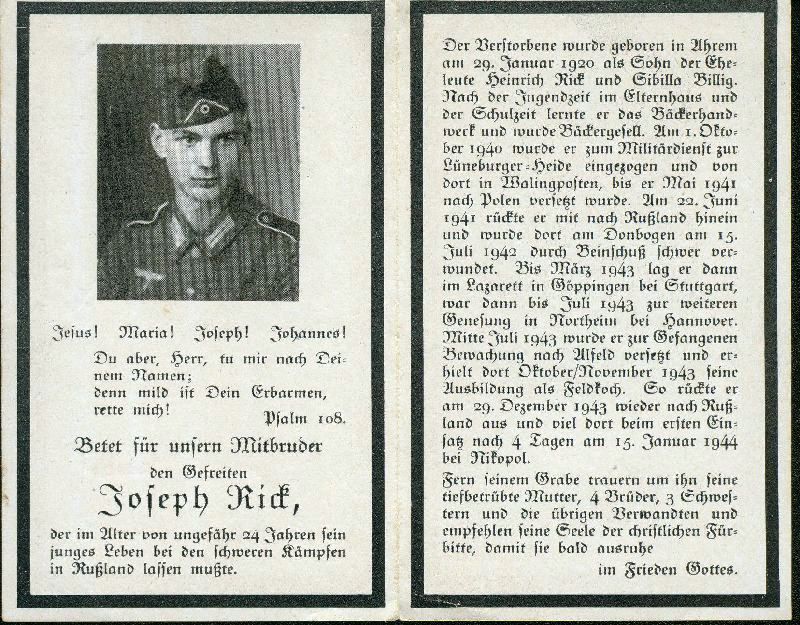 Bäcker; Eltern: Heinrich Rick und Sibilla Billig; Gefallener 2. Weltkrieg |