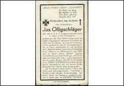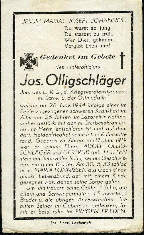 Eltern: Adolf Olligschläger und Gertrud Hütten; ∞ 30.5.1933 Maria Tönnissen aus Goch; 1 K.; Gefallener 2. Weltkrieg |