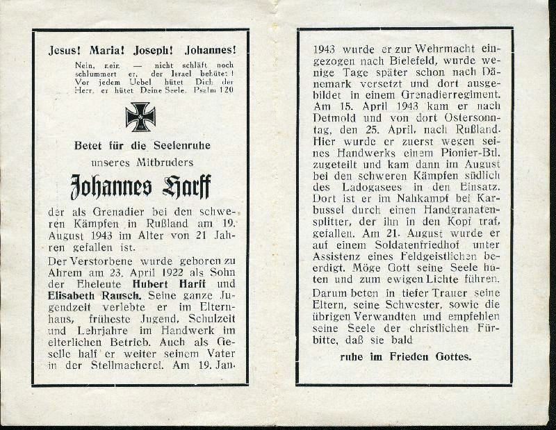 Stellmacher; Eltern: Hubert Harff und Elisabeth Rausch; Gefallener 2. Weltkrieg |
