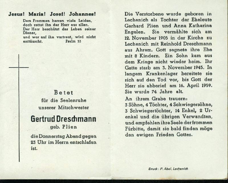 Eltern: Gerhard Plien und Anna Katharina Engelen; ∞ 12.11.1905 Reihold Dreschmann † 3.11.1945; 8 K. davon 1† |