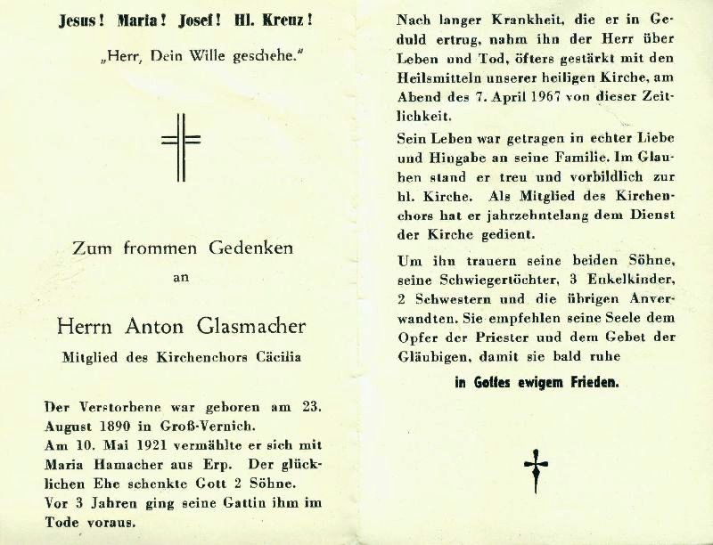 ∞ 10.5.1921 Maria Hamacher 1964†; 2 K. ; Mitglied des Kirchenchores |
