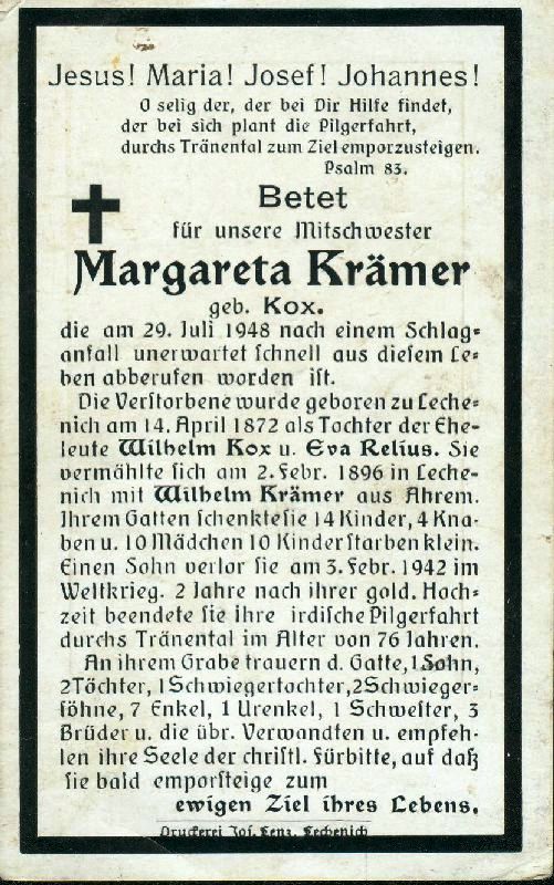 | Eltern: Wilhelm Kox und Eva Relius; ∞ 2.2.1896 Wilhelm Krämer aus Ahrem; 14 K. davon 11 †|