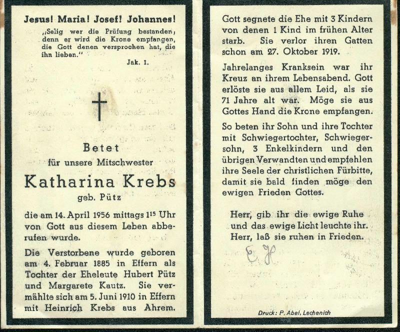 | Eltern: Hubert Pütz und Margarete Kautz; ∞ 5.6.1910 Heinrich Krebs †27.10.1919; 3 K. davon 1 †|