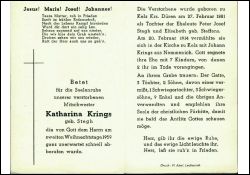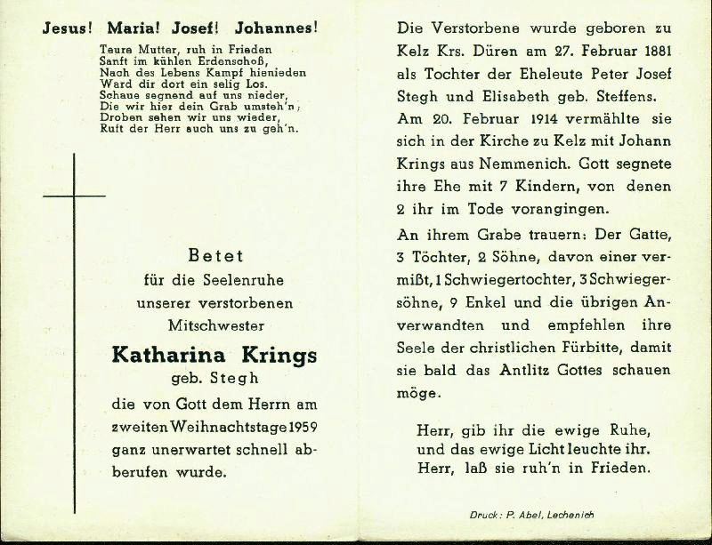 | Eltern: Peter Josef Stegh und Elisabeth Steffen; ∞ 20.2.1914 Johann Krings aus Nemmenich; 7 K. davon 2 †|