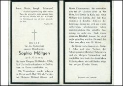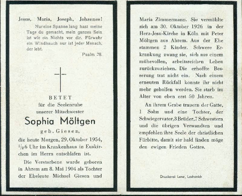 | Eltern: Michael Giesen und Maria Zimmermann;∞ 30.10.1926 Peter Möltgen aus Ahrem; 2 K. |