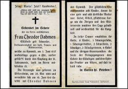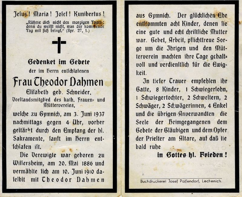 ∞ 10.6.1910 Theodor Dahmen aus Gymnich; 8 K.; Vorstandsmgl. d. kath. Frauen- u. Müttervereins |