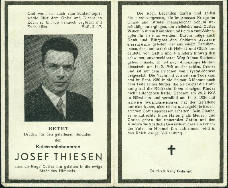 Reichsbahnbeamter; ∞ 14.8.1934 Agnes Wollersheim; 4K.; Gefallener 2. Weltkrieg |