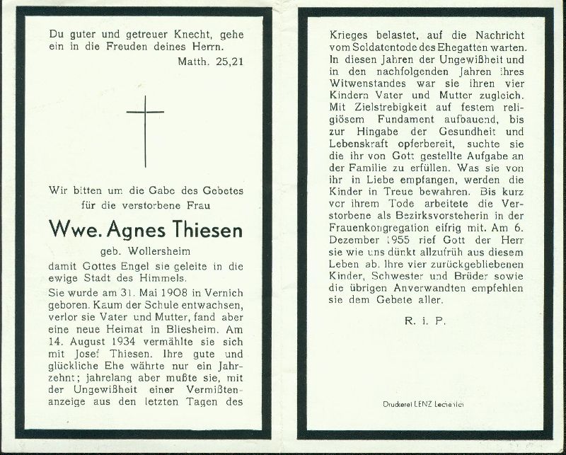 ∞ 14.8.1934 Josef Thiesen; 4 K.; Bezirksvorsteherin Frauenkongregation |
