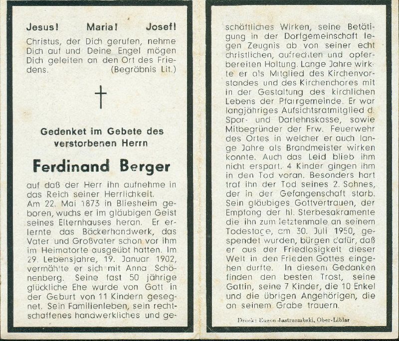 Bäcker; ∞ 19.1.1902 Anna Schönenberg; 11 K. davon 4 †; Mitgl. Kirchenvorstand, Kirchenchor; Ausichtsratd. Spar- u. Darlehnskasse; Brandmeister d. freiw. Feuerwehr |